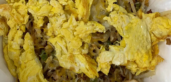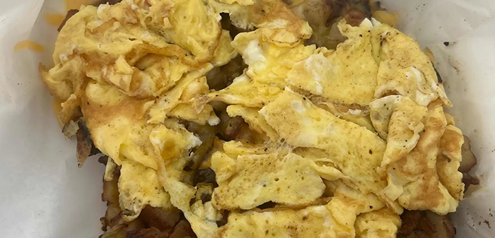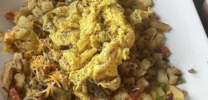 Choice of ham, bacon or sausage sautéed with green peppers and onions added to your choice of hash browns or home fries. Topped with two eggs and cheese and a side of toast.