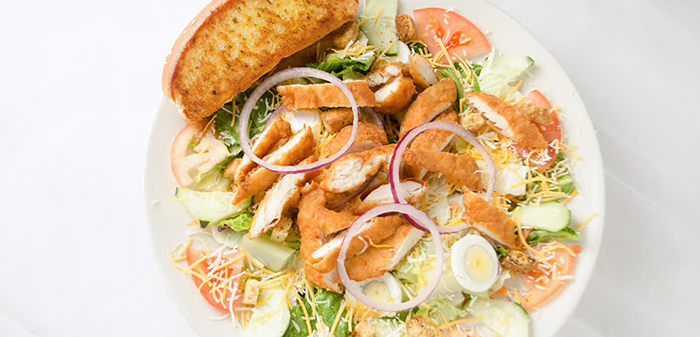 Served with garlic toast. Crispy all white chicken breast strips on abed of salad mix, with egg, cucumber, red onion, croutons, tomatoes and cheddar cheese