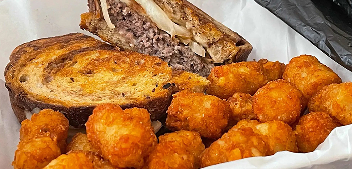 8oz Angus Burger, grilled onions, and Swiss cheese served on marbled rye served with a side of thousand island, French fries, onion rings or tater tots. Substitute bowl of soup or salad add $1.75