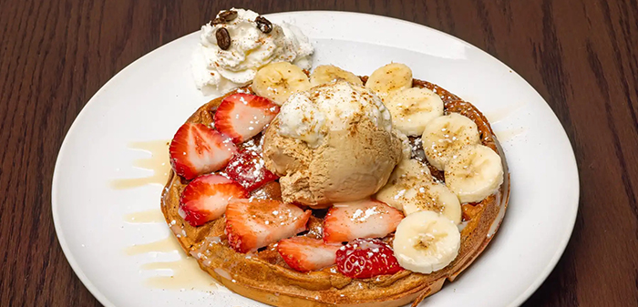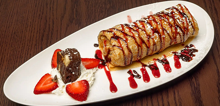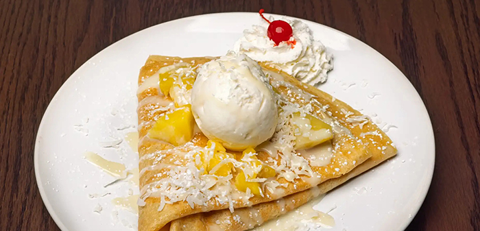 Dulce de Leche, Strawberry, Banana, Vanilla Ice Cream, Coffee Ice Cream, Garnish With White Chocolate, Powdered Sugar & Cinnamon.