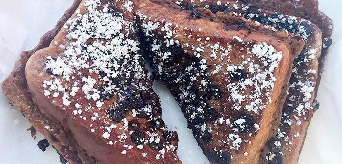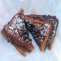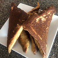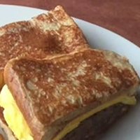 ham, bacon or sausage, Swiss cheese and eggs melted between 2 slices of French toast
