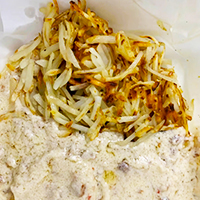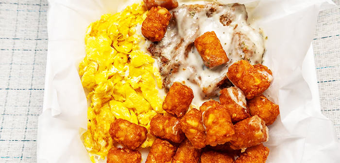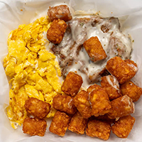 1/4 biscuits and gravy with hash browns or home fries.$8.50