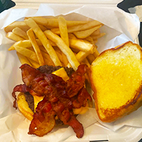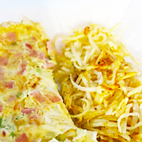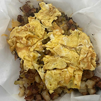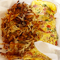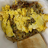 Choice of ham, bacon or sausage sautéed with green peppers and onions added to your choice of hash browns or home fries. Topped with two eggs and cheese and a side of toast.