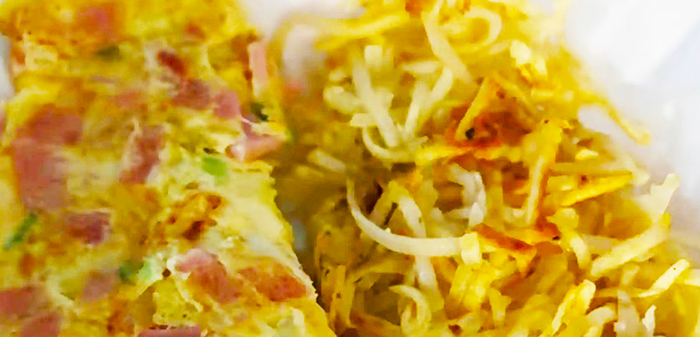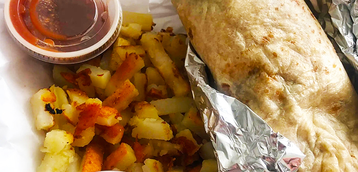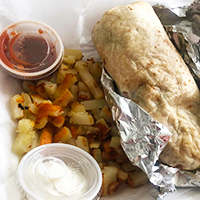3 Scrambled eggs with green peppers, onions, mushrooms and tomatoes, choice of bacon, sausage, ham or chorizo and cheese, wrapped in a flour tortilla accompanied with home fries, hash browns or tater tots
