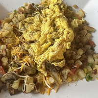Chorizo, sautéed onions, green peppers and tomatoes, choice of hash browns or home fries topped with cheese and 2 eggs.