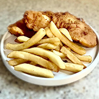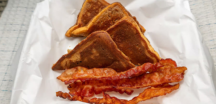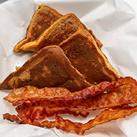 Choice of two French toast or two pancakes with two eggs, two bacon, and two sausage links.