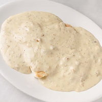Homemade biscuits split in half, covered with homemade ...$6.00