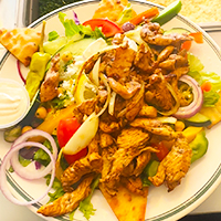 Grilled chicken strips served with seasoned rice, black beans, and shredded cheese.