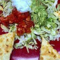 Nachos topped with chicken breast or steak, cooked fajita vegetables, topped with cheese sauce, lettuce, pito de gallo, sour cream and guacamole.